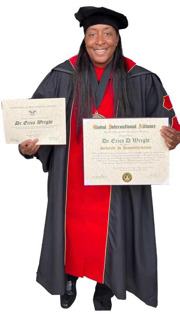 U First Founder Erica Wright received an honorary doctorate degree in humanitarian from the Global International Alliance. A special Thank You to Dr. Sarah Hurd for nominating me and seeing my heart to be of service to the people who need us the most. She also received the Lifetime Achievement Award signed by President Joe Biden is such an amazing honor.